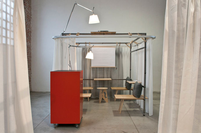 Packed into a trunk, the portable space contains all the necessary elements needed to work and rest. It consists of a metal structure that supports a translucent and sound absorbent curtain.